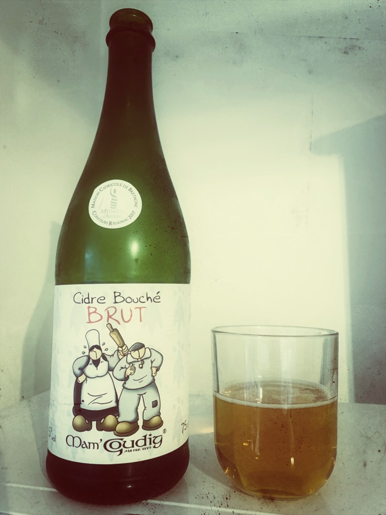 After all the classic, traditional labels adorning the other bottles hauled back from Normandy and Brittany, this one is a bit of a mystery. It shows a woman battering a guy over the head with a rolling pin for reasons that are not immediately obviously. I went to university in France (25 years ago now) but I haven’t spent much time there since so my knowledge of French culture is sketchy to say the least these days. Which explains why I had no idea who or what Mam’ Goudig is. I did however recognise the production address on the bottle – Pleudihen sur Rance – as the home of the Celliers Associés co-operative and naturally wondered why cartoon domestic violence was the apparent theme of the label.